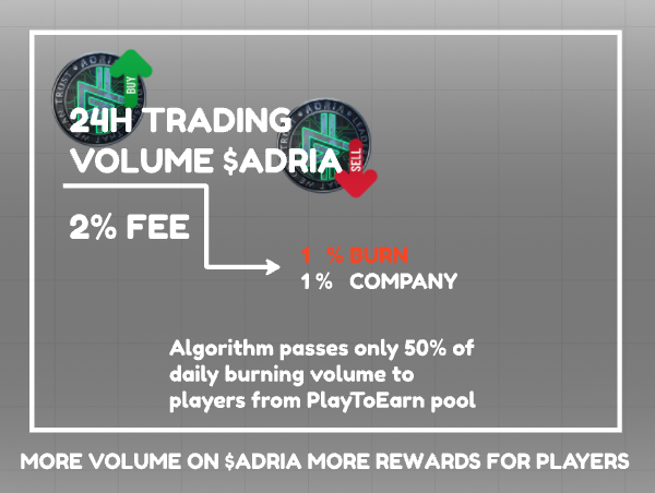 In each game, players will be rewarded for their achievements with rewards. The PlayToEarn token pool will affect the supply of ADRIA, in order to prevent too much inflation, the allocation of tokens for prizes will depend on the number of tokens burned. The greater the overall value transfer, the greater the rewards will go to players.