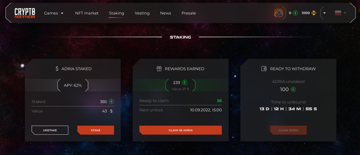 $ADRIA staking is a mechanism to reward long-term investors in the Crypto Mayhem project.